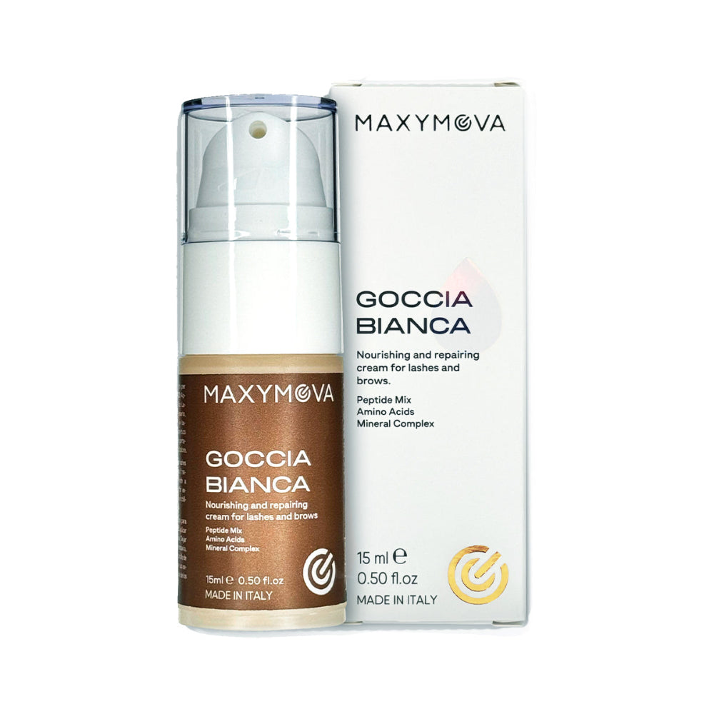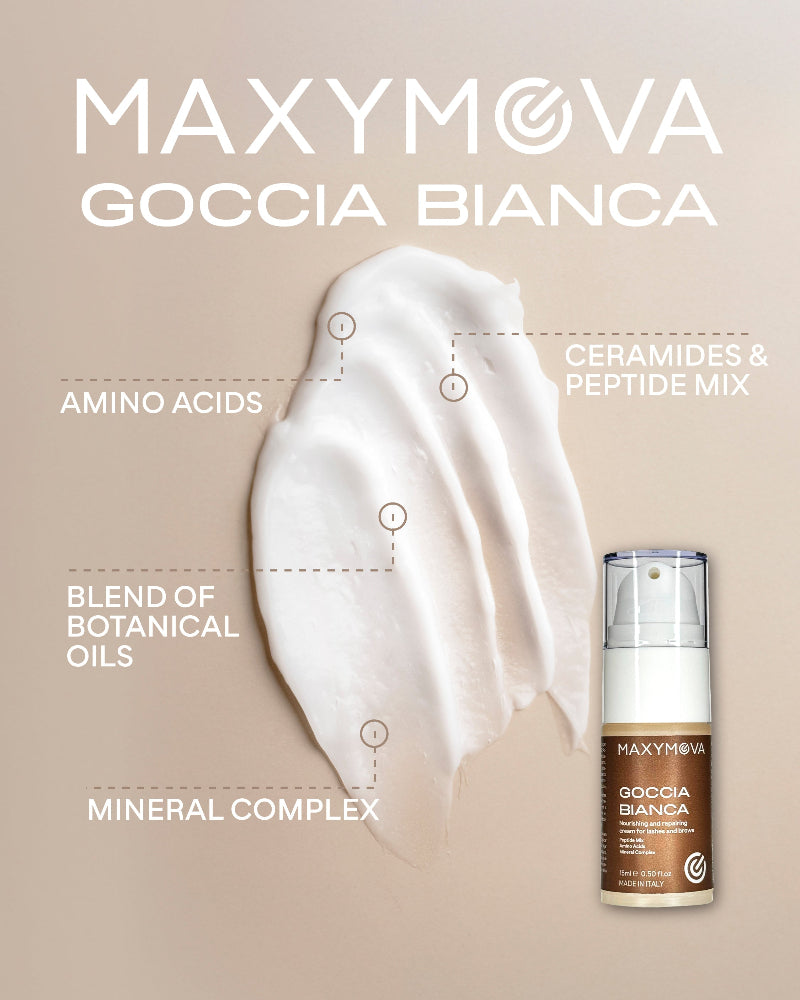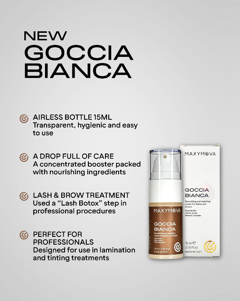 Apply a small amount of Goccia Bianca onto lashes or eyebrows after lamination and tint.